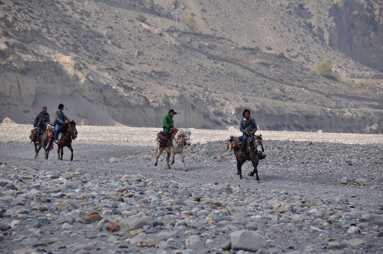 Der Weg führt teilweise neben, teilweise im Flussbett. Uns begegnen einige tollkühne Reiter. Ob es sich dabei um Khampa, ehemalige Guerilla - Krieger aus Tibet handelt, die noch vor wenigen Jahren von Nepal aus die Chinesen bekämpft haben?