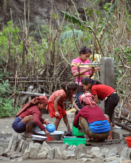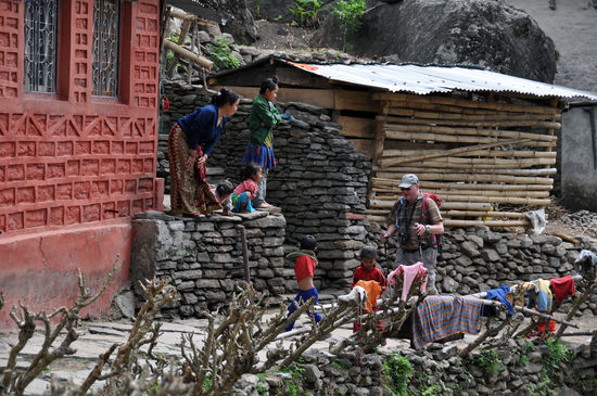 Beim Überschreiten sorgen die heftigen Schwingungen und der darunter durchrauschende Marshyangdi für Nervenkitzel. Auf der anderen Seite geht es in den Ortskern von Bhulbhule. Hier ist aber noch alles sehr verschlafen. Nur ein paar Hühner, ein Hund und einige wenige Einheimische sind auf der Strasse. Wir folgen der Ostseite entlang des Marshyangdi. Der Weg führt uns durch Felder und malerische Dörfer. Auf den Feldern wird emsig gearbeitet, Frauen waschen vor den Häusern Wäsche oder Geschirr und Kinder spielen mit selbstgemachtem Spielzeug. Alles macht einen freundlichen und friedlichen Eindruck. Wir entspannen, schalten geistig ab und lassen alle Probleme hinter uns.