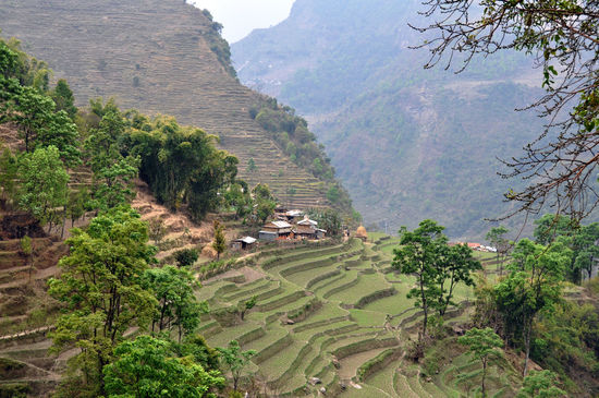 Unterwegs hatten wir zwischen Ngadi und Bahundanda einen kurzen Blick auf den Manaslu. Insgesamt ist das Wetter aber diesig bis bedeckt und es herrscht eine hohe Luftfeuchtigkeit bei warmen 22°C.