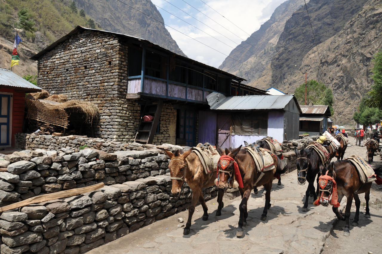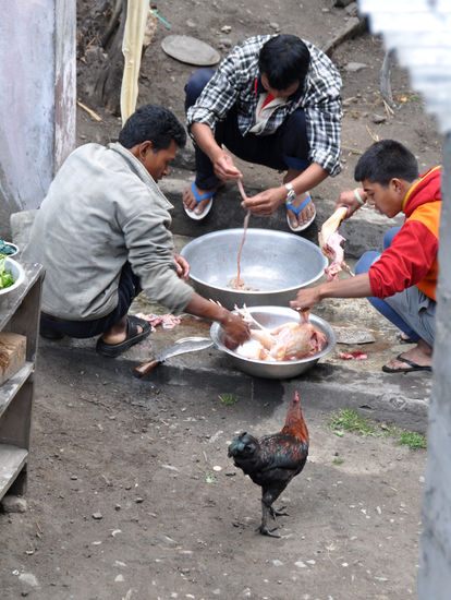 Gestärkt von vegetable soup, vegetable fried marcaroni und Cola verlassen wir den Ort und gehen unter mehrmaligem Wechsel der Uferseite über große Hängebrücken weiter. Um 15 Uhr erreichen wir Dharapani (1900m). Die letzten 10 Minuten werden aufgrund eines Regenschauers flott zurückgelegt. Die zunehmende Höhe merkt man an der sinkendenTemperatur. Wir erreichen nur mehr angenehme 13-16°C Tagestemperatur. Der Regen lässt bald nach. In der Küche bestätigt sich, dass wir nur vegetarisch essensollen und wollen. Auf einem aus Ästen gebauten Holzregal liegt beim Nachmittagstee ein gerupftes Huhn. Als wir am Abend schlafen gehen, liegt es noch immer dort. Die Bakterien (Salmonellen, Chambylobacter) und co freuen sich.