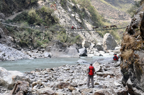 Wie schon am Vortag gehen wir nachdem Frühstück um 7 Uhr los. Eine gute Stunde müssen wir der Strasse oder eben dem, was hier so genannt wird, folgen, bevor es steil hinab zum Marshyangdi geht. Über eine Hänge-brücke wechseln wir zum straßenfreien Ostufer. Von hier geht es weiter nach Tal wo wir bereits um 11:15 eintreffen, früher als von unserem Guide erwartet.