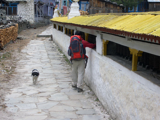In den Nachtstunden setzt bei mir ein wässriger Durchfall ein, der mich wiederholt aus meinem Schlafsack treibt. In der Früh fühle ich mich schwach, habe keinen Appetit und muss alle 15 Minuten aufs Klo. Immodium traue ich mir nicht einzunehmen, solange nicht alles draußen ist. So wird der Abmarsch erst einmal um gut 30 Minuten verschoben. Schließlich sistiert der Durchfall und wir entschließen uns zum Aufbruch. Da ich aber doch geschwächt bin, verschwindet meine Nikon D90, die ich sonst um den Hals trage, heute im Rucksack und die Stöcke kommen bei mir zu ihrem ersten Einsatz. Auf der heutigen Etappe könnte man den Manaslu sehen, währe er nicht durch Wolken verhüllt. Zu meinem Glück geht es erst mal nur mäßig bergauf. Die ersten Chörten und Mauern mit Gebetsmühlen tauchen auf.