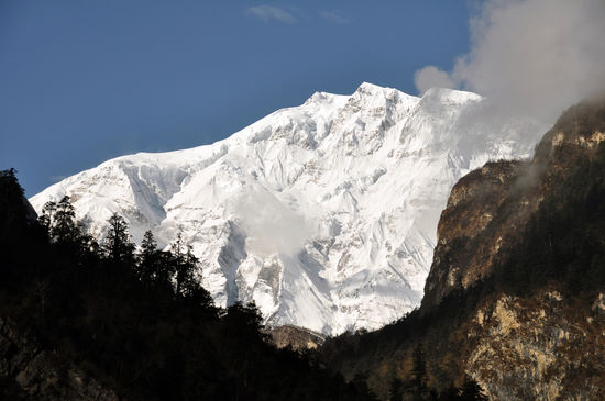 Um 13:30 erreichen wir unsere Lodge in Lower Pisang (3300m). Das Zimmer ist bezogen und wir brechen alleine nach Upper Pisang auf. Upper Pisang liegt 200-300m höher auf der gegenüberliegenden Seite des Marshyangdi und ist der ursprüngliche Ort. Er besteht aus zum Schutz vor dem Wind dicht aneinander gedrängten Häusern in klassischem Baustil. Leider haben wir nur einen kurzen Ausblick auf den Annapurna II, da Wolken aufgezogen sind. Aber für ein schnelles Foto lässt er sich kurz blicken. Da die ursprüngliche Gompa im Ortskern bereits sehr baufällig war, wurde von den Bewohnern am höchsten Punkt eine neue errichtet. Dazu musste jeder Bewohner aus der Umgebung entweder 54 Arbeitstage innerhalb eines Jahres leisten, oder einen hohen Geldbetrag spenden.