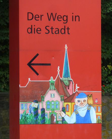 Bereits der erste Stein an dem Wegweser in die Stadt macht uns neugierig: Dagmar Glemme hat die ganze Stadt mit ihren Steinen künstlich gestaltet.