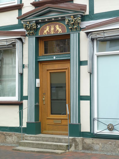 Die Eingangsfront des (alten) Rathauses, einem im Kern gotischen Backsteinbau, wurde von 1789 bis 1790 spätbarock überformt. Das Klassizistische Portal verweist auf die Verleihung der Stadtrechte im Jahre 1270.