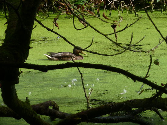 Nach Überquerung einer kleinen Brücke führt der Weg zum Deich, von dem aus man auf einen alten Eichenbestand sieht. In diesen hohen Bäumen besteht eine Graureiherkolonie mit über 250 Brutpaaren. Die Kolonie entstand in den 1950er Jahren und ist die größte in ganz Schleswig-Holstein. Mit einer Flügelspannweite von 1,70 m und einer Länge von etwa 90 cm ist der Graureiher fast so groß wie ein Storch, hat ein graublau gefärbtes Gefieder und einen gelborangefarbenen Schnabel.
