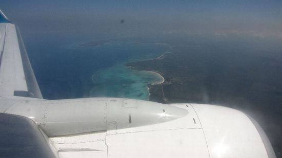 Beim Anflug auf Sansibar konnten wir über das Triebwerk hinweg die Küstenlinie mit den weißen Stränden sehen, die Sandbänke und die Riffe im Wasser.