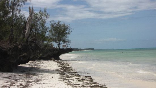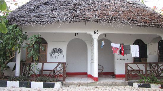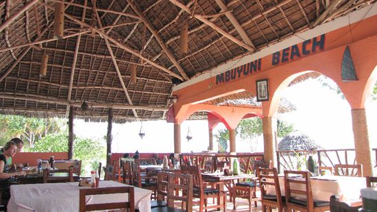 Das Hotel Mbuyuni liegt unmittelbar am Strand und besteht nur aus einigen kleinen Bungalows und dem Restaurant. Unser Wunsch nach einem der vorderen Bungalows wurde erfüllt, weniger als 50 Meter von Wasser entfernt (Bei Ebbe mehr...).