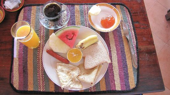 Die Sonne stand schon um 6:00 Uhr am Himmel, als wir den ersten Strandspatziergang machten. Das Frühstück war mit Toast, Eier, Pfannkuche, Wurst und verschiedenen Früchten lecker, umfangreich und passte zu der Umgebung mit Sicht auf den weißen Strand, die Palmen und das hellblau-türkisene Meer.