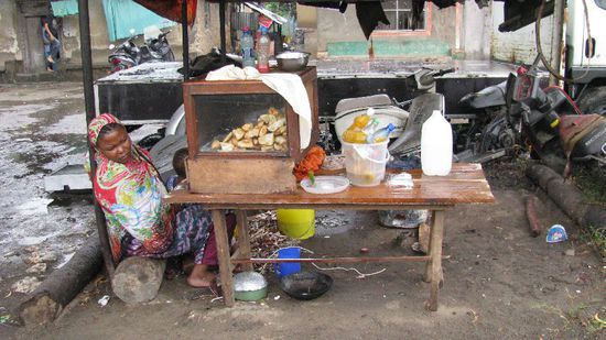 Schon lange, bevor man Stone Town erreicht, nehmen links und rechts die Verkaufshütten und rollenden Garküchen zu, die trotz des strömenden Regens ihre Waren anpreisten.