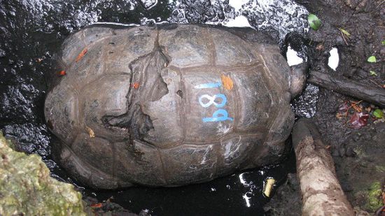 Wobei die älteste Schildkröte nur in einer Senke im Matsch liegt. Vielleicht liegt sie da schon seit Jahren?