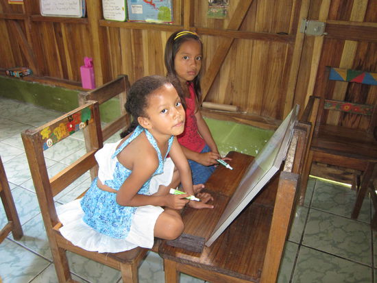 Ungewöhnlich: Im Vordergrund sieht man 2 Erwachsene Männer Bilder ausmalen. Viele Eingeborene kennen solche Sachen nicht von ihrer Kindheit und freuen sich über die Bilder