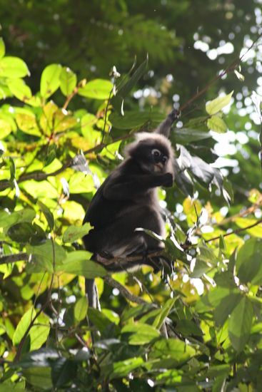 Der Schock war schnell verdaut und um noch ein bisschen was von der Insel sehen zu können, machten wir uns auch recht bald wieder auf den Rückweg zu unserem Fahrer. Als wir den Pfad durch den Wald entlang liefen, bemerkten wir auf einmal Bewegungen über uns im Geäst und blickten hinauf. Und da sahen wir ihn: einen kleinen, süßen, ganz dunklen Affen. Wir standen still, um ihn zu beobachten und auf einmal bemerkten wir, dass der ganze Wald über uns lebte. Ich zückte natürlich gleich die Kamera, um die kleinen, herzigen Burschen einzufangen, aber das war mal gar nicht so einfach! Ein paar Minuten gaben wir uns dem Schauspiel hin, dass sich uns da bot, aber die Zeit drängte.
