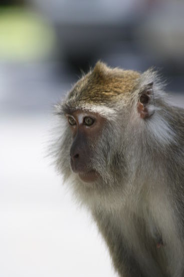 Kaum zu glauben, aber wahr, wenige Minuten später, passierte mir gleich der nächste Unfall. Während wir die steile Straße zum Parkplatz zurückliefen und ich mich noch eifrig mit den anderen über die Affen unterhielt, zog es mir schon wieder den Boden unter den Füßen weg. Keine Ahnung, auf was ich diesmal ausgerutscht war, aber ich lag schon wieder am Boden und freute mich schon darauf, am nächsten Tag die ganzen blauen Flecke zählen zu dürfen. Mir war Gott sei Dank wieder nix Schlimmes passiert, aber wie tollpatschig kann man eigentlich sein?! Am Parkplatz angekommen, liebäugelten einige von uns schon wieder mit Kokosnüssen und zur Abwechslung auch mit Eis, während andere mal wieder unseren Fahrer suchten. Und ich entdeckte einen weiteren Affen - diesmal straßenkötergrau - der sich gerade an einer Mülltonne mit "Leckereien" bediente. Während ich noch den Affen fotografierte, hatten die anderen unseren Fahrer gefunden und ich allesamt verloren. Aber kurz darauf saß ich dann auch mit im Wagen und man hatte mir die "Ehre" zugeteilt, neben unserem Guide zu sitzen, der mich in Grund und Boden quatschte.
