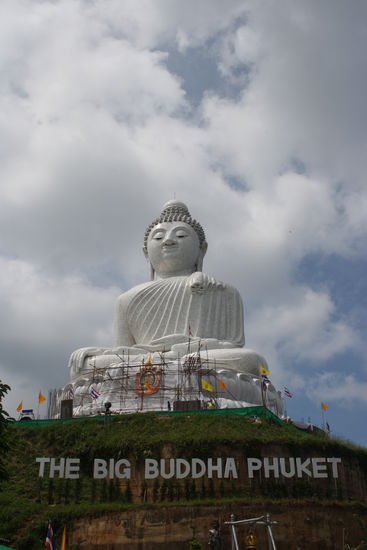 Am nächsten Morgen organisierten wir uns wieder unsere Roller und auf ging es zum Big Buddha. Chris und Jutta waren zwar schon mal da gewesen, aber bei meinem ersten Aufenthalt auf Phuket, war die Zeit zu knapp und das Wetter nicht immer optimal gewesen, um zum Buddha auf den Berg zu fahren. Daher wollte ich das dieses Mal auf jeden Fall nachholen. Das schöne Wetter hielt an, meine stillen Gebete vom ersten Abend waren also erhört worden und die Regenzeit schien tatsächlich und endgültig beendet zu sein. Nachdem wir die 4-spurige Straße und den "Kreisverkehr des Todes" in Chalong hinter uns gelassen hatten, ging es stetig auf einer kurvigen Straße bergauf und es machte richtig Spaß, mit dem Roller die Straße entlang zu pesen. Beim Big Buddha, der 45m hoch und 25m breit ist, angekommen, parkten wir unsere Roller und wollten uns direktemente zu der Riesenstatue begeben, wurden aber völlig unerwartet angehalten. Im ersten Moment dachte ich, man wolle uns irgendwas verkaufen, bis ich kapierte, dass ich nicht ordnungsgemäß gekleidet war und meine Schultern zu bedecken hatte. Warum ausgerechnet ich und nicht andere, der vielen "ärmellosen" Touristen angehalten wurde, lassen wir mal so stehen, aber letztendlich hängte ich mir brav einen hässlichen Fetzen Stoff um die Schultern und setzte meinen Weg fort.