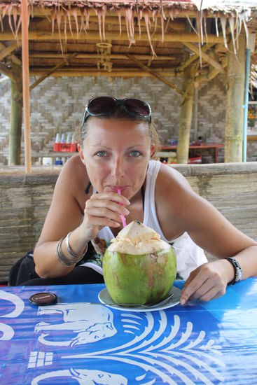 Im Schatten des Pavillons mit Blick auf's Meer chillten wir den Rest des Tages ein wenig, legten zwischendurch eine Runde Volleyball ein, bis Mig beschloss, dass es Zeit war, die Kokosnüsse an der Palme neben dem Pavillons zu ernten. Also kletterte er 5 Meter in die Höhe, hackte eine Nuss nach der anderen ab, die wir unten fleißig aufsammelten und in dem Anhänger seines Salengs verstauten. Eine Kokosnuss köpften wir dann auch gleich - gut, das war also meine letzte... Und während wir dann dasaßen und unsere Ernte genossen, sahen wir auf einmal, wie sich eine giftgrüne Schlange die Palme hinunterschob, an der Mig nur wenige Minuten zu vor noch gehangen hatte.