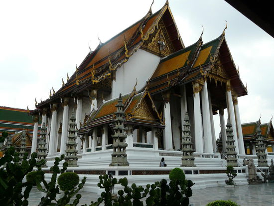 Heute ist unser vorerst letzter Tag in der Stadt der Engel. Und der begann wie üblich heiß und mit viel Lauferei. Nach dem Frühstück ging es los zum Central Pier und mit dem Expressboot bis Memorial Bridge. Dann hieß es den Stadtplan richtig zu interpretieren und den Golden Mount am besten ohne viele Umwege zu finden. Was uns auch tatsächlich gelungen ist. Dann mal rauf auf den Hügel und die schöne Aussicht bewundern. Da heute Sonntag ist, sind auch zahlreiche Einheimische zum Beten am Ort. Jede Umrundung, der goldenen Stupa wird von ihnen mit drei kräftigen Gongschlägen beendet. Die gehen einem echt durch Mark und Bein. Nach 30 Minuten hat man das Gefühl, der ganze Körper vibriert und man fühlt sich schon fast selbst wie ein einziger großer Gong. Also sind wir den Berg wieder runter vibriert und anscheinend haben die vielen guten Vibrationen unseren Geist derart geklärt, dass wir nicht wie letztes Mal, den falschen sondern auf Anhieb den richtigen Ausgang gefunden haben. Vielleicht liegt es aber auch daran, dass Andreas den besseren Orientierungssinn hat. Wie auch immer.... Zur großen Schaukel und zum Wat Suthat(ltd. Lonely Planet dem stimmungsvollsten Tempel der Stadt) wollten wir jetzt. Auf dem Weg mitgenommen haben wir noch das Demokratie Monument und irgendeine der vielen Rama Statuen. Bei den vielen Rama's kommt man manchmal etwas ins Schleudern. Auch Wat Suthat haben wir problemlos gefunden, langsam wird es unheimlich. Und direkt davor stand die große Schaukel. Eher unspektakulär, da niemand geschaukelt hat. Aber gefunden haben wir sie und das ist es, was zählt. Wat Suthat ist tatsächlich ein sehr schöner und stimmungsvoller Tempel und da wie gesagt Sonntag war, gab's auch einen zünftigen buddhistischen Gottesdienst. Lotus, Räucherstäbchen und Verbeugungen inklusive.