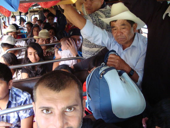 So fanden wir uns in einem Bus mit 44 Sitzen inmitten von 80 Personen, Hühnern, Katzen, Tomatenkisten, Reissäcken usw. Die 2er Sitze wurden zu 3er oder 4er Sitzen umfunktioniert. Auf unserer Bank klappte das leider oder auch zum Glück nicht, wegen dem zu breiten Gesäß von Deniz. Wieder mal spät nachts kamen wir verloren und verlassen in Quetzaltenango an. Unsere Rucksäcke wurden am Ortseingang vom Busdach geschmissen und ehe wir das geschnallt hatten, war der Bus schon weg. Nach planlosem Rumirren und als uns eine sehr nette Frau darauf hinwies, dass wir uns in dieser Ecke um die Uhrzeit besser nicht aufhalten sollten, fanden wir doch noch eine Höhle zum Schlafen.