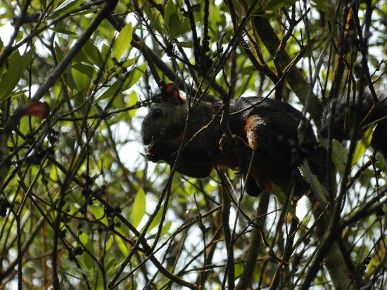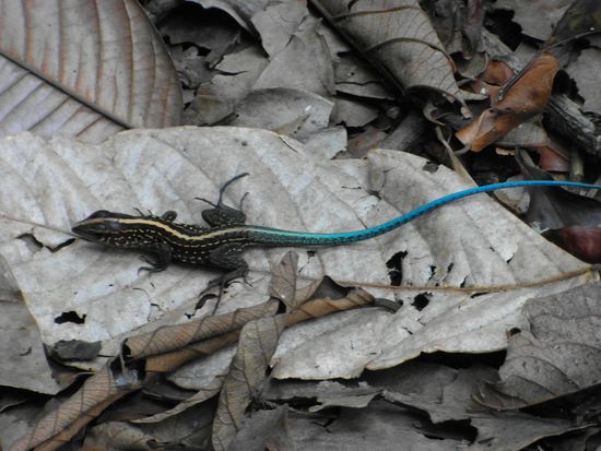 Den nächsten Tag starten wir getrennt, während Linda und Daniel den Tag in Ruhe angehen, ausschlafen, den Ort La Fortuna erkunden und bereits früh in die Therme wollen, sind Caro und Sven früh auf den Beinen, um den Nationalpark des Vulkans Arenal zu besuchen. Mit dem öffentlichen Bus geht es Richtung Nationalpark, von der Haltestelle sind es noch 1,5 km zum Eingang, dort müssen die obligatorischen 10$ Eintritt gezahlt werden und mit einer Karte bewaffnet geht es auf eine 7km lange Wanderung. Dieser Nationalpark ist ganz anders als der in Manuel Antonio. Unterwegs sieht man kaum Touristen, der Wald ist total wild und umgeben von einer Geräuschkulisse, die so laut ist, dass Caro sich richtig fürchtet. Sven geht den Geräuschen nach und findet heraus, dass diese von Kolibris stammen, aber für Caro ist es unvorstellbar, dass die kleinsten Vögel der Welt so einen Lärm machen... . Auf der Wanderung begegnen uns viele Tiere (die meisten von Caro entdeckt!!!). Highlight sind neonfarbende Eidechsen, Tukane und unglaublich zahme Nasenbären. Sven freut sich sehr, als er Blattschneideameisen entdeckt, deren Ameisenstrasse unseren Wanderweg kreuzt und warnt nun die uns entgegen kommenden Wanderer, auf die Ameisen zu achten und nicht zu zertreten.