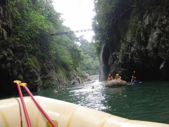 Wir raften also über den Rio Pacuare, es macht irre viel Spaß, die Landschaft ist toll und wir genießen die erste Stunde auf dem Fluss. An einer sehr starken Stromschnelle, geht ein Mann über Bord: Sven! Mit gemeinsamen Kräften hieven wir ihn ins Boot und weiter geht's. Doch diese Stromschnelle hat es in sich, ein paar Meter weiter knallen wir auf einen Felsen, der Kanadier geht baden, Daniel können wir gerade noch so wieder hereinziehen doch unser Boot erleidet Schiffbruch. Der Boden hat einen Riss, die Luft ist raus (welch treffendes Wortspiel!!!). Hilft aber nichts, wir müssen, nachdem der Kanadier wieder an Bord ist, weiter paddeln. Und wie wir paddeln müssen. Unser Boot ist voll mit Wasser, wir kommen nur schleppend voran, sind mit den Kräften am Ende und vor uns liegen noch 20km! Na toll! Einige Meter weiter, an einer ruhigen Stelle, ziehen wir unser Boot an Land und treffen auf andere Raftinggruppe. Die beiden Guides versuchen vergeblich unser Boot zu flicken. Hilft nichts, wir müssen weiter mit dem kaputten Boot. In der Hoffnung, dass wenn das Boot leichter ist, wir besser voran kommen, wechseln die beiden Kanadier zu der anderen Gruppe. Wir paddeln noch eine ganze Stundeweiter, mit den Kräften am Ende. Das ist total gefährlich ist, da wir ständig auf Felsen knallen und keinen schützenden Boden mehr unter uns haben und wir uns auch nicht mit unseren Füßen, wie eigentlich üblich, festklemmen können und andauernd Gefahr laufen aus dem Boot zu fallen... .Wir schaffen es so gerade bis zum nächsten Halt. Hier beschließt unser Guide nicht mit dem Boot weiter zu raften und es dort zurück zu lassen. Wir werden auf andere dortige Rafts aufgeteilt. Weil wir durch unseren Unfall so viel Zeit verloren haben, sind wir leider zu spät fürs Mittagessen, die Fotografen mit all den schönen Fotos von uns sind leider auch schon weg. So steigen wir irgendwann um 16 Uhr mit großem Hunger, total erschöpft, ohne Fotos, dafür aber mit einer unvergesslichen Story mit viel Drama im Gepäck in den Bus Richtung Karibik.
