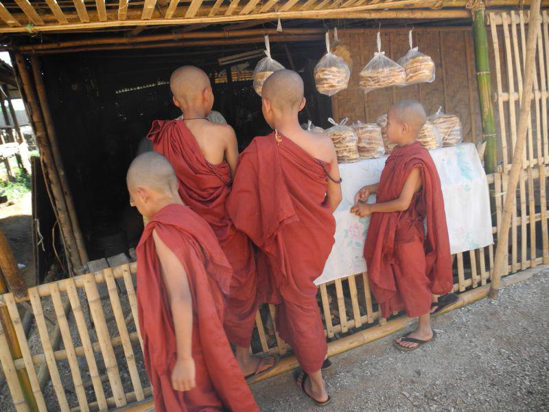 Nach dem Frühstück beschließen wir für heute auch wieder ein Boot zu chartern. Wir wollen einen Ausflug nach Indein machen. Erst geht es wieder über den See und durch Dörfer. Dann biegen wir in einen Fluss ab. Hier könnte man bestimmt auch gut Kayak fahren. Der Fluss ist sehr kurvernreich. Dann erreichen wir die Anlegestelle. Von hier aus kann man sich nicht mehr verlaufen, es geht immer zwischen den Verkaufsständen lang . Wir gehen zuerst noch zu einem Platz wo scheinbar gerade ein neues Haus (Kloster) gebaut wird. Das Gerüst steht schon, komplett aus Bambus. Mönche weihen grad die Baustelle ein. Frauen kochen essen. Wahrscheinlich gibt es hier später noch eine Party. 4 kleine Mönche kommen auf uns zu, sie wollen uns einen Buddha oben auf einem Hügel zeigen. Na dann los, ich überleg während des Aufstiegs schon mal wieviel Geld sie denn nachher haben wollen.