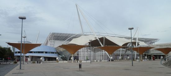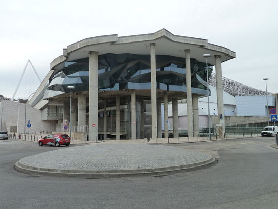 gilt als architektonisches Meisterwerk mit seinen verwundenen konstruktiven Elementen aus Metallstreben, Pfeilern und Glasflächen.