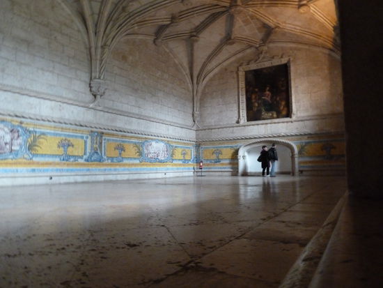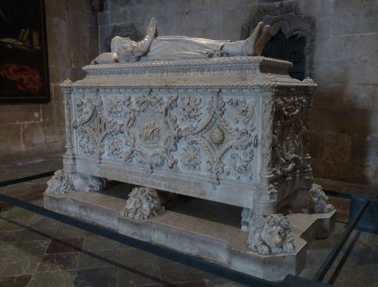 Links vom Haupteingang ist der mächtige Sarkophag für Vasco da Gama zu sehen. Der zweite auf der rechten Seite soll leer sein. Beide Grabmäler entstanden Ende des 19. Jh. während der Wiederentdeckung der goldenen Ära Portugals, was sich in der Einarbeitung vieler Details aus jener Zeit (portugiesisches Wappen. Christusritterkreuz, Armillarsphäre und eine Karavelle) zeigt-