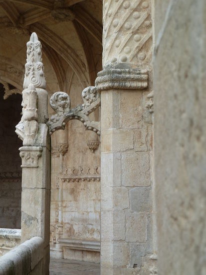 Den in reinster Manuelinik von Diogo de Boytaca (unten) und Jojo de Castil-ho (oben) ausgestalteten zweistöckigen Kreuzgang (Claustro) erreicht man vom Westportal aus.
