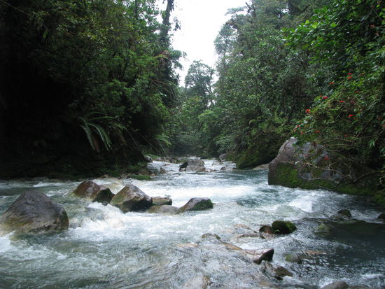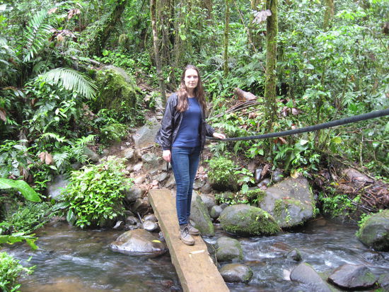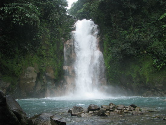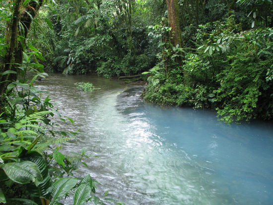 Der nächste Tag brachte weiterhin Regen und wir sahen leider keinen Vulkan. So machten wir einen Ausflug zum Rio Celeste. Wir hatten schon viel Gehört von dem türkisfarbenden Fluß am Vulkan Tenerio. Am National Park Eingang mußten wir nicht einmal die obligatorischen 10 $ bezahlen, weil an diesem Eingang es nicht nötig war sagte uns der Ranger. Fein. So wanderten wir los. Als erstes sahen wir einen wunderschönen Wasserfall. Der Weg war gut markiert und gar nicht schlammig nach dem Regen. Dann kamen wir zu dem Ort wo sich die Bäche mischen und wir die Türkisfarbe des Baches noch intensiver bewundern konnten. Es gab viele kleine Brücken zu überqueren und wir landeten zum Schluß bei der zweiten Parkrangerstation. Dort nahm uns ein Bauarbeiter mit dem Auto mit und setzte uns an einer im Bau befindlichen Brücke ab und zeigte uns den Weg zur zweiten Rangerstation. Die Brücke überquerten wir dann und liefen noch eine ganz Weile zu unserem Auto. Eine wirklich tolle Wanderung!