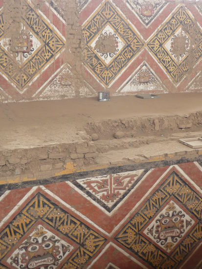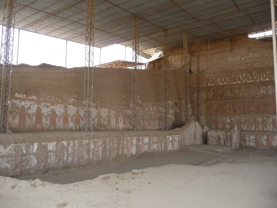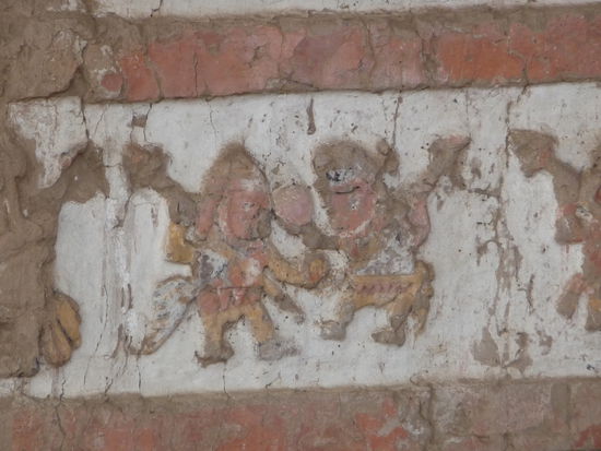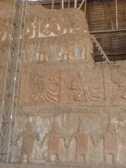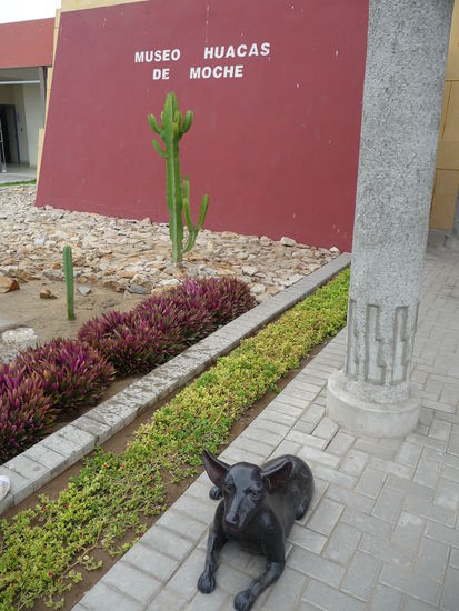 Nach dem ich gestern Abend in Trujillo angekommen bin und in einem guten Hotel übernachtet und gut gefrüchstückt habe fuhr ich heute an Tag 3 meiner Peru Reise mit dem Taxi am frühen Morgen erst einmal ca. 7 Km südöstlich der Stadt zum südlichen Ufer des Rio Moche. Ziel war die Besichtigung der größten präkolumbischen Heiligtümer Südamerikas der Sonnen und Mondpyramide erbaut aus Millionen von Adobe Ziegeln. An Ihrer Ferigstellung arbeiteten Tausende Menschen über einen langen Zeitraum während der Mochica Kultur die Ihre Blütezeit von 200 bis 800 n. Chr. hatte.Während die etwas größere Sonnenpyramide wahrscheinlich das wichtigste Heiligtum der Mochica war und dem Regenbogen geweiht war diente die etwas kleinere Mondpyramide dem Totenkult.Umwelteinflüße in den letzten 1500 Jahren und vor allem Grabräuberei und sonstige Schatzsucher haben den beiden bedeutenden Bauwerken der Mochica stark zugesetzt so das heute vieles verschwunden oder in einen sehr schlechten Zustand ist. Trotzdem gelang es Forschern und u.a. auch deutschen Archäologen Grabbeigaben,Malereien und Reliefs zu endecken und zu sichern. Viele dieser einmaligen Schätze sind in einem kleinen Museum unweit der Pyramiden zu sehen das 2008 eröffnet wurde. Eintritt Museum 3 Soles = 0,88 Euro. Eintritt Mond und Sonnenpyramide 10 Soles = 2,94 Euro.