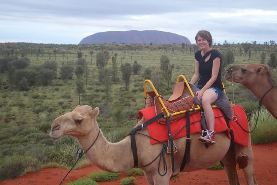 Ich werde also, nachdem ich mit Taschenlampe bewaffnet an den Bungalows der hier Arbeitenden zum nächsten Hotel gelaufen und dort abgeholt wurde, zur Kamelstation gefahren und noch völlig verschlafen auf ein Kamel namens Connor gepackt. Der Sonnenaufgang bleibt leider aus - es ist noch immer zu wolkig. Trotzdem ist die Stimmung hier wieder ganz besonders: Es ist die Zeit zwischen Nacht und Tag, es ist noch kühl und ganz still; in der Ferne laufen ein paar Dingos vorbei und schauen neugierig. Nur der Mensch, der mich auf das Kamel setzt und auf dem Kamel vor mir Platz nimmt, redet viel zu viel, redet ohne Punkt und Komma; erzählt über Kamele, über sein Leben mit den Kamelen, über sein Leben vor den Kamelen, über seinen letzten Urlaub in Europa. Und es ist noch nicht mal hell; was mache ich hier eigentlich?