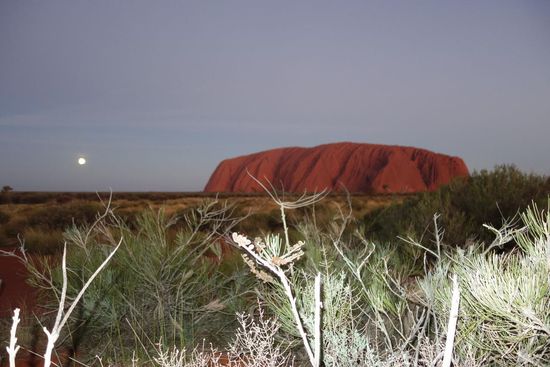 Abschließend fahren der Pajero und ich natürlich noch zum obligatorischen Sonnenuntergang. Obligatorisch - für Deutsche, denn die sind hier fast unter sich, warum auch immer. Der Uluru zeigt sich heute, nachdem es ja die letzten Tage bewölkt war, von der besten Seite und leuchtet magisch. Als Draufgabe geht, sobald die Sonne untergegangen ist, der Vollmond auf. Was ein mystisches Bild, was ein gelungener Fast-Abschied aus Australien. Hätte ich die Gabe vernünftige Fotos machen zu können, wäre heute ein noch besser Tag gewesen. Aber da ich das nicht kann, müsst Ihr Euch eben mit den üblichen Schnappschüssen zufrieden geben.
