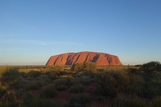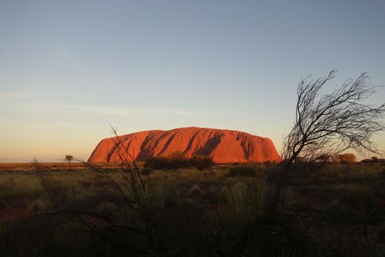 Gut, das waren Wanderung Nummer eins und zwei. Nun bleibt noch die Umrundung des Uluru, 9 Kilometer im Umfang. Und diese will ich laufen, wenn schon, dann richtig. Nun, es ist schon spät, muss ich eben schneller laufen um pünktlich zum Sonnenuntergang wieder zurück zu sein. Und das gelingt mir auch. Die Wanderung ist - wie man sich ja sicher vorstellen kann - flach, ein Rundweg eben. Und deshalb nicht weiter interessant, wäre da nicht dieser Gesteinsberg. Und dieser hat wirklich eine besondere Ausstrahlung, nicht nur weil er für die Aborigines ein heiliger Ort ist und von der Tourismusbranche gehypt wird - die schräg einfallende Sonne wirft Licht auf den Stein und dieser, ja dieser leuchtet wirklich, wie auf den Bildern, die jeder kennt, nur intensiver, massiver, besser.