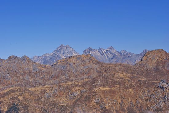 Der See liegt auf 3'800 Metern. Doch wir wollen noch höher, denn wir wollen in der Nähe auf einen Berg hochsteigen. Um dort hoch zu kommen, braucht es zuerst die Einilligung des Militärs. Diese bekomme wir und wir steigen langsam hoch. Der Weg ist sehr steil und kräfteraubend. Zuoberst stehen wir auf ca. 4'400 Meter. Von hier aus sieht man die Berge von Tibet. Die Grenze liegt nur 10 km (Luftlinie) entfernt.