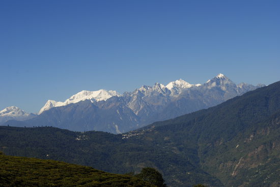 Auf der Fahrt sehen wir zum ersten Mal den Himalaya. Die Berge sind in diesem Gebiet über 7'000 Meter hoch.