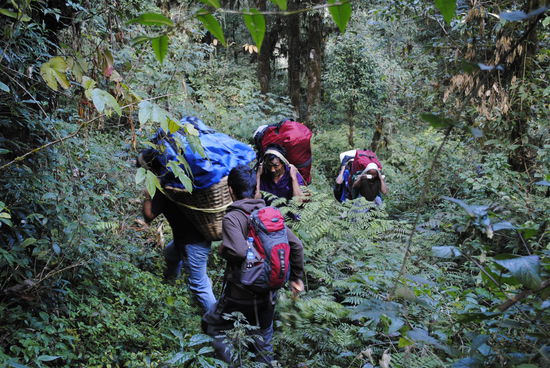 Wieder gehts früh morgens los. Ein 7 Std. Marsch steht bevor. Kurz darauf stehen wir mitten im Dschungel. Für uns ist kein Weg erkennbar. Drei Männer von unserer Crew gehen voran und schlagen mit ihren Macheten eine Schneise (Weg kann man dies nicht nennen). Wir werden auf die gefährlichen Pflanzen aufmerksam gemacht. Ebenso auf die Brennesseln, welche 2 Meter hoch werden können. Diese brennen ein viefaches mehr als unsere zu Hause (ich spreche gerade aus Erfahrung).