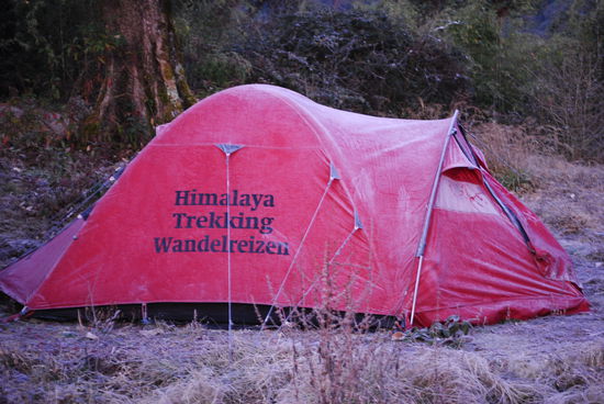 Als wir frühmorgens aus dem Zelt kraxeln, schauen wir nicht schlecht. Es ist alles weiss und gefroren. Nach einem kurzen Frühstück wandern wir nochmals 6 Stunden. Der höchste Punkt, welchen wir erreichen ist über 3500 Meter.