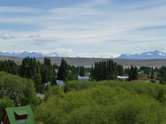 Heute war die Nacht kurz. Erst konnte ich vor lauter Reisefieber und neuen Eindrücken nicht einschlafen, dann polterten Hotelgäste laut durch's Haus und um 3 Uhr war ich dann endgültig wach. Also raus aus den Federn, unter die Dusche und den Rucksack reisefertig gepackt. Um 4.15 Uhr war ich startklar an der Rezeption. Schon kurz darauf stand überpünktlich das Taxi vor der Tür und durch das frühmorgendliche Buenos Aires waren wir in gut 30 Minuten ohne Verkehrschaos am Airport. Dort klappte ebenfalls alles wie am Schnürchen und der nette Steward am Check-In sprach sogar deutsch mit mir. Dann war endlich Zeit für ein Frühstück mit Kaffee und Croissant zu Airport-Preisen. Aber ok - Hauptsache etwas im Magen. Der Flug startete planmäßig und ich hatte am Notausgang weitaus mehr Platz als auf dem Langstreckenflug. Dafür vermisse ich das französische Frühstück, das ich mir zum Glück noch am Boden genehmigt hatte. Bei Aerolineas gab's nur eine Packung trockener Kekse und einen Kaffee. Nach vierstündigem Flug ist dann auch El Calafate in Sichtweite und mit der beeindruckenden Kulisse der schneebedeckten Andengipfel lande ich gegen 10.00 Uhr. Svenja empfängt mich bereits freudestrahlend am Gepäckband und die Wiedersehensfreude ist wirklich groß. Sie hat auch einen netten Taxifahrer organisiert, der uns zum Hostel in El Calafate bringt.
