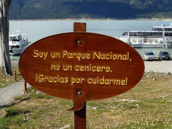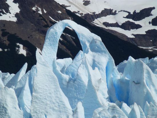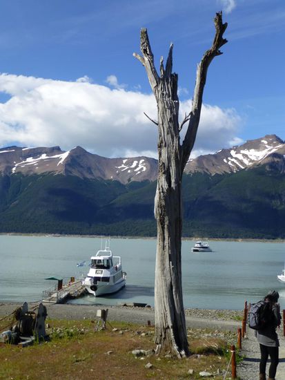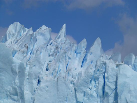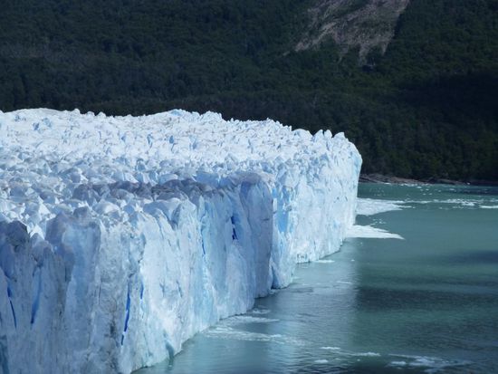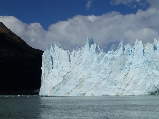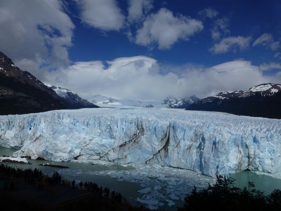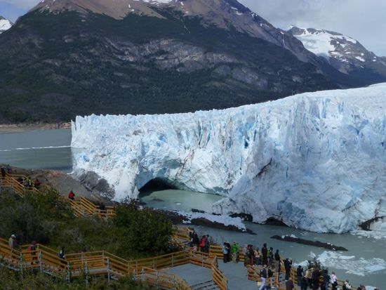 Um 9.45 Uhr sind wir am Bootsanleger im Nationalpark und von hier aus startet eine Tour direkt zum Gletscher. 60 Meter hoch, 5 Kilometer breit und 35 Kilometer lang - so die Daten - endet er im Lago Argentino. Schon die Anfahrt im Boot ist sehr beeindruckend. Ständig heißt es "Eisberg voraus", denn überall treiben Eisbrocken auf dem Wasser. Wir fahren ziemlich nah an die Abbruchkante wo mit lautem Getöse Eisbrocken ins Wasser stürzen. Die Tour dauert etwa eine Stunde, dann bringt uns der Bus weiter zum Besucherzentrum. Hier haben wir 2,5 Stunden Zeit über Brücken und Stege den Gletscher aus den unterschiedlichsten Perspektiven anzuschauen und vor allem anzuhören. Überall knackt und rauscht es, dann wieder töst mit lautem Knallen wieder ein Stück Eis ins Wasser. Es ist einfach nur beeindruckend und fast schon surreal. Wir mögen uns gar nicht satt sehen an dieser Naturgewalt. Die Zacken und Spalten sehen immer wieder anders aus, je nach Licht und Perspektive. Da steht der Mensch einfach nur stumm und staundend da. Ehrfurcht ist ein großes Wort, aber ich glaube, ich spüre sie hier. Und welch ein Kontrast zur turbulenten Großstadt, in der ich noch vor kurzem war. Dort Lärm und Hektik, hier die Weite und Einsamkeit einer berauschenden Natur.