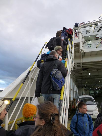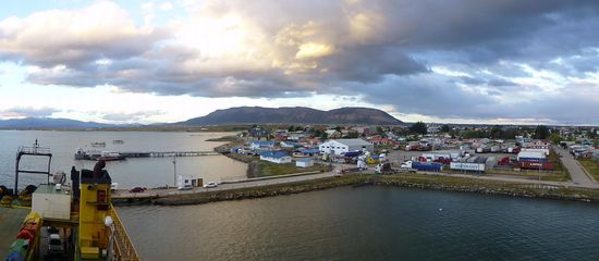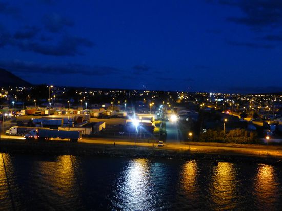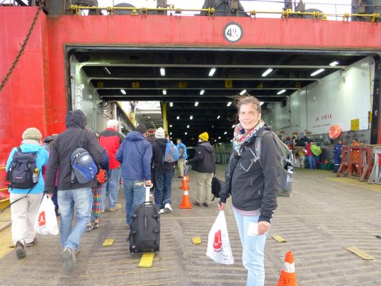Svenja fragt die Arbeiter einer Autofähre und die schicken uns wieder zurück in Richtung Stadt. Wir müssen uns noch einige Male durchfragen bis wir die richtige Stelle im Hafenhotel finden. Hier dürfen wir einchecken - was wieder mal mit Warten verbunden ist - und bekommen die Bordkarte. Die Rucksäcke können wir hier lassen, aber an Bord des Schiffes geht es erst um 21 Uhr. Also müssen wir irgendwie den Tag rumbringen. Wir gehen shoppen, bummeln durch's Städtle, machen ausgiebig Mittagspause im Café und kommen um 16 Uhr gerade rechtzeitig in den Hafen, um das Einlaufen der Evangelistas zu beobachten. Das Fährschiff soll für die nächsten drei Tage und vier Nächte unser Heim auf dem Wasser sein und uns von Puerto Natales nach Puerto Montt bringen. Durch die Fjordlandschaften und die Einsamkeit Südpatagoniens. Das Teil ist größer als wir gedacht haben und von Bord gehen nur begeisterte Menschen. Überwiegend Rucksack-Touristen wie wir. Da kommt doch Vorfreude auf!!!
