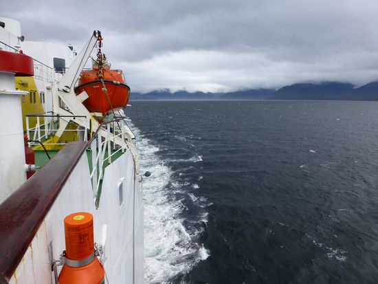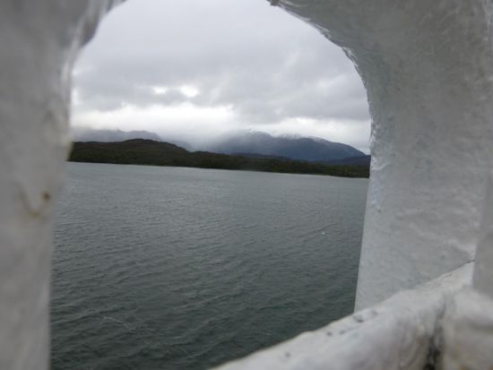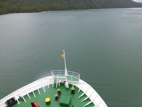 Das Mittagessen mit Fisch ist heute eher so-la-la. Da wir in der 2. Essenschicht sind, ist der Fisch leider fast kalt. Aber dafür kommen wir endlich etwas ausführlicher mit unseren Zimmergenossen ins Gespräch. Nach dem Essen schaffen wir es tatsächlich, in einer windgeschützten Ecke fast eine Stunde lang draußen zu sitzen. Fast kommt sogar die Sonne raus, so dass wir den Nachmittag überwiegend an der frischen Luft verbringen können und nur zum kurzen Aufwärmen nach drinnen gehen. Bei der Einfahrt in den Golf von Penas ist das Wetter wieder schlechter und inzwischen schaukelt unser Kahn schon ganz gewaltig. Die Fahrt über die Golf dauert fünf Stunden, die anschließende "Open-Water-Strecke" über den Pazifik sieben Stunden. Die sollen überwiegend in der Nacht sein. Ich bin schon gespannt, ob die Schaukelei in der engen Kajüte überstehen werde.