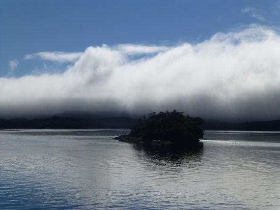 Die Gegend wird jetzt auch grüner, bewaldet und als sich der Nebel immer wieder ein wenig lichtet, sehen wir auch die vielen Lachszüchter am Ufer. Auch können wir auf dem spiegelglatten Wasser wieder Vögel, Pinguine und Seehunde beobachten. Die Sonne lässt sich zwischendurch immer häufiger sehen (der Käptn hatte doch Recht) und allmählich kommt Kreuzfahrt-Feeling auf. Der Vormittag verläuft mit einem sanften Gleiten durch den Nebel. Immer wieder tunt sich eine Lücke auf und es bieten sich fantastische Ausblicke auf grüne Hügelketten, kleinste Inselchen und schneebedeckte Berggipfel. Dass wir in "bewohntere" Gegenden kommen, zeigt sich am zunehmenden Schiffsverkehr. Trotzdem können wir die Begegnungen an zwei Händen abzählen. Auch Handy-Netz gibt es wohl wieder, denn die Angestellten stehen alle telefonierend an Deck.