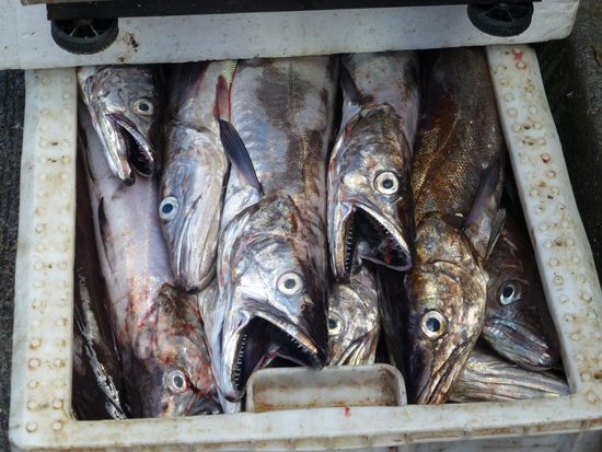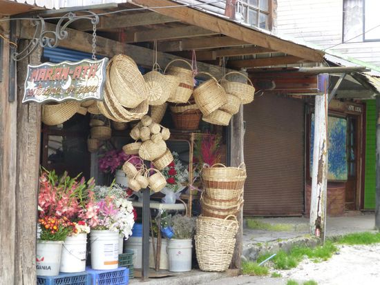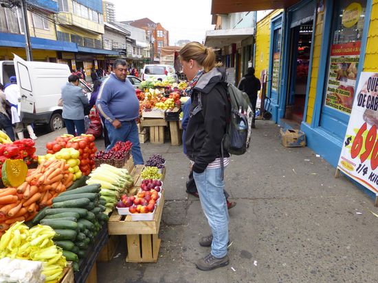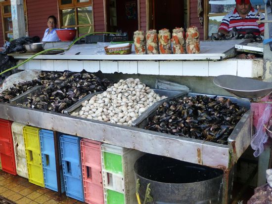 Wir bummeln entlang des Piers bis zum Viertel Angelmó wo sich viele Kunsthandwerker mit Marktständen niedergelassen haben. Auch der Fischmarkt mit Fischrestaurants und Markthallen ist hier. Die Restaurants befinden sich in den sogenannten "Palafitos", Häusern, die über das Wasser auf Stelzen gebaut sind.