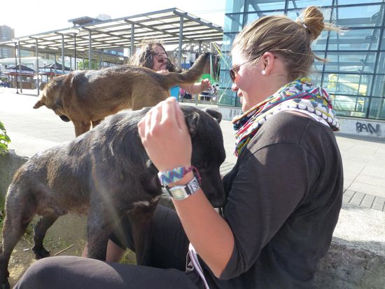 Aber irgendwann klappt es doch und wir leisten uns ein Taxi zum Hostel. Eine kluge Entscheidung, denn unser Domizil liegt zwar zentral, aber steil am Berghang mit Blick auf Puerto Montt. Das Hostel "Train del Sur" ist eine wirklich liebevoll eingerichtete Herberge mit urigem Ambiente im Stil eines alten Zuges. Leider funktioniert WLAN nicht, so dass wir uns nur kurz am Rezeptions-PC zuhause melden und Hostels für die nächsten Tage reservieren. Dann machen wir uns auf den Weg in die Stadt, die diese Bezeichnung wieder einmal verdient. Die Hafenstadt hat ca. 176.000 Einwohner und ist Verwaltungszentrum der "Región de los Lagos". Nach den Tourismus-Hochburgen El Calafate und Puerto Natales ist dies eine Stadt, in der die Menschen leben, wohnen und arbeiten. Lebendig und bunt. Aber auch auf unsicherem Boden. 30 km entfernt liegt der angeblich aktivste Vulkan Chiles und 1960 wurde die Stadt durch ein Erdbeben sehr stark zerstört. Während unseres Aufenthaltes blieb jedoch alles ruhig