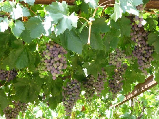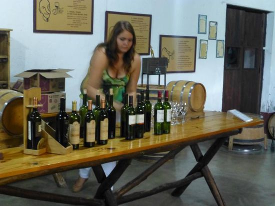 Eine junge Dame führt uns durch den Betrieb, zeigt uns den Weinberg, der hier eher einer flachen Plantage gleicht und wo sich unter einem riesigen Walnussbaum auch ein kleines Freiluftrestaurant befindet. Olivenbäume werden hier ebenfalls zahlreich angebaut. Sie sollen die Reben vor Sturm und Sonne schützen. Wir bekommen einen Weißwein, der mich sehr an "unseren" Muscat aus Frankreich erinnert sowie einen roten Malbec zu verkosten. Die gehobeneren Weine gibt es gegen eine Gebühr von 15 Pesos zu probieren und hier ist der Malbec Roble kein ganz schlechter Tropfen.