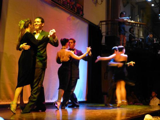 Wir fahren wieder zurück nach San Telmo, kaufen noch ein paar Mitbringsel, legen ein wenig die Beine hoch und werden dann um 19 Uhr vom Sammeltaxi für unseren Tango-Abend abgeholt. Der Fahrer bringt uns zu einer altehrwürdigen Tango-Schule im Zentrum. Untergebracht in einem imposanten Gebäude mit hohen Räumen. Hier müssen wir zunächst feststellen, dass wir den Nachmittag besser für den Kauf eines schicken Kleidchens und High-Heels genutzt hätten. Es sind etliche brasilianische Mädels samt Eltern da, die ihre schickste Abendgarderobe ausführen. Da kommen wir uns fast ein bisschen "underdressed" vor, aber den Vogel schießen dann doch andere Touristen ab, die in Flip-Flops und Shorts gekommen sind.