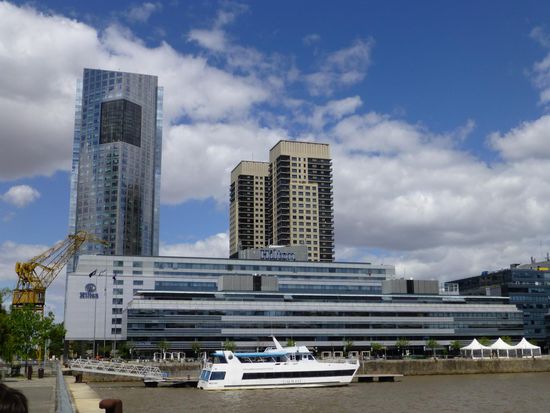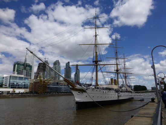 An Schlaf war jedoch wegen der beengten Verhältnisse und ziemlich heftiger Turbulenzen dann nicht wirklich zu denken. Doch auch diese 13 Stunden gingen vorbei. In Buenos Aires lief dann fast alles wie am Schnürchen. Aber eben nur fast. Ich durfte mich gleich mal in der Lieblingsbeschäftigung der Argentinier üben: Schlange stehen um Geld zu wechseln. Eine satte Stunde dauerte die Prozedur bis ich die Pesos in der Tasche hatte und mich zum Taxi in Richtung Centre Ville zu begeben. Mein Hotel liegt wirklich im Herzen der Stadt. Blick zum Hinterhof, ich erhöhe den Altersdurchschnitt wohl drastisch, aber nett und sauber in WLAN. Zu Fuß war ich dann gleich 3 Stunden unterwegs bis runter an den Hafen und wieder zurück. Zum Abendessen gabs dann Pizza und Cerveza. Bei soooo vielen italienischen Einwanderern kann man damit nicht viel falsch machen