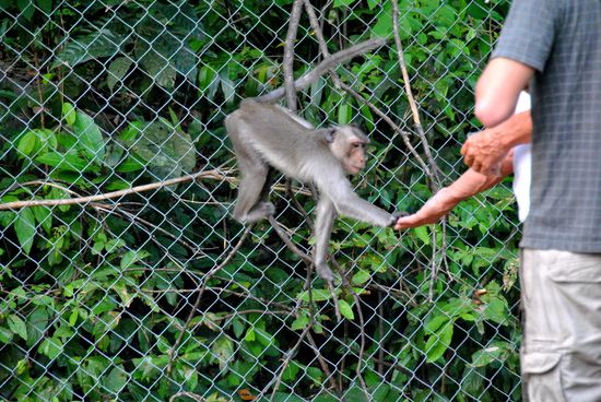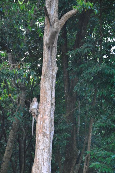 gegen 4 h machen wir uns auf den rückweg zum hotel. wir kommen vorbei an einer stelle, wo direkt neben der straße der (ur-)wald beginnt. um diese zeit kommen jede menge affen an den straßenrand und lassen sich von einheimischen und barangs (fremden/ausländern) füttern. riesenspaß für kai! und auch ich habe meine freude am beobachten - mit und ohne die kamera vor den augen. ganz interessant: die affen haben erdnüsse aus der hand genommen und zwar ganz unterschiedlich von affe zu affe manche haben alles auf einmal aus der hand gerissen und manche haben tatsächlich nuss für nuss einzeln ordentlich aus der hingehaltenen hand genommen! sind halt doch recht menschen-ähnlich!