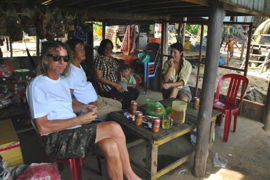 auf einmal werden wir in eine hütte hereingebeten - na ja, herunter wäre eher der richtige begriff, denn diese meisten hütten, die im prinzip nicht mehr als bretterverschläge sind, stehen auf stelzen. wir setzen uns auf kleine plastikstühle und nun sind wir die exoten... immer wieder kommen dorfbewohner, auch viele kinder - diese hütte ist übrigens ein laden - und wir werden neugierig betrachtet.