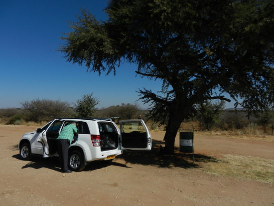 Alle paar Kilometer steht ein Baum oder ein strohbedeckter Sonnenschirm mit einem steinernen runden Picknicktisch mit Steinbänken drum herum. Ideal für uns! Uns so geniessen wir unseres erstes Namibia-Picknick im angenehmen Schatten eines grossen Baumes, streichen uns Sandwichs und kochen uns Kaffee. Das macht Spass!